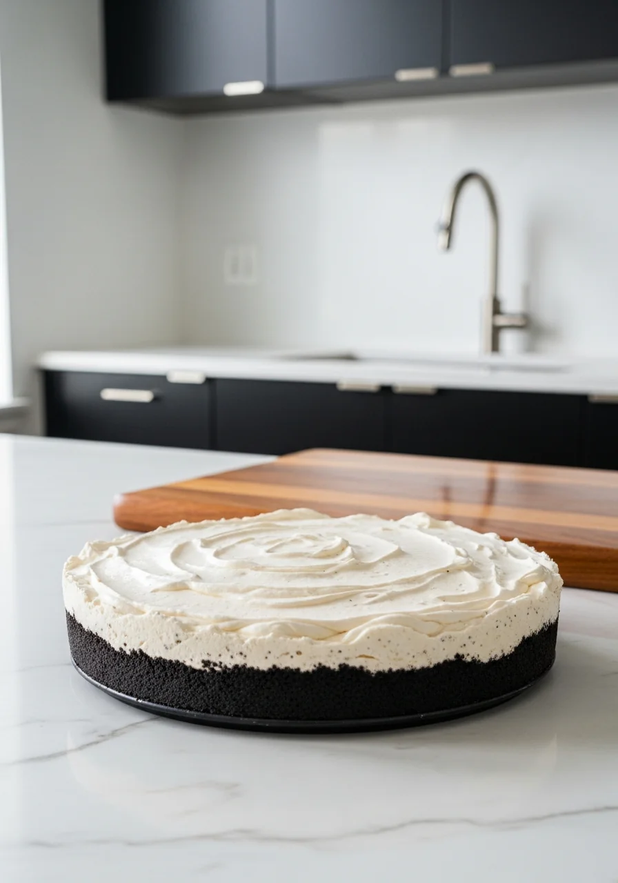 Spread the filling over the chilled crust, smooth the top, and sprinkle with extra crushed Oreos or chocolate shavings if desired.