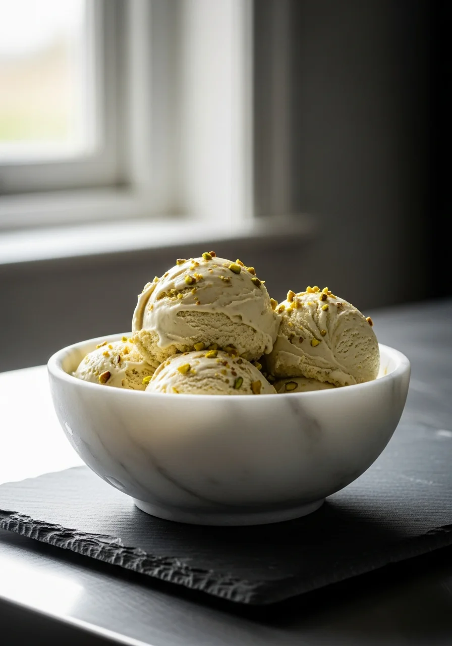 A velvety pistachio ice cream that captures the garden-fresh scent of roasted nuts, perfect for a comforting scoop any season.